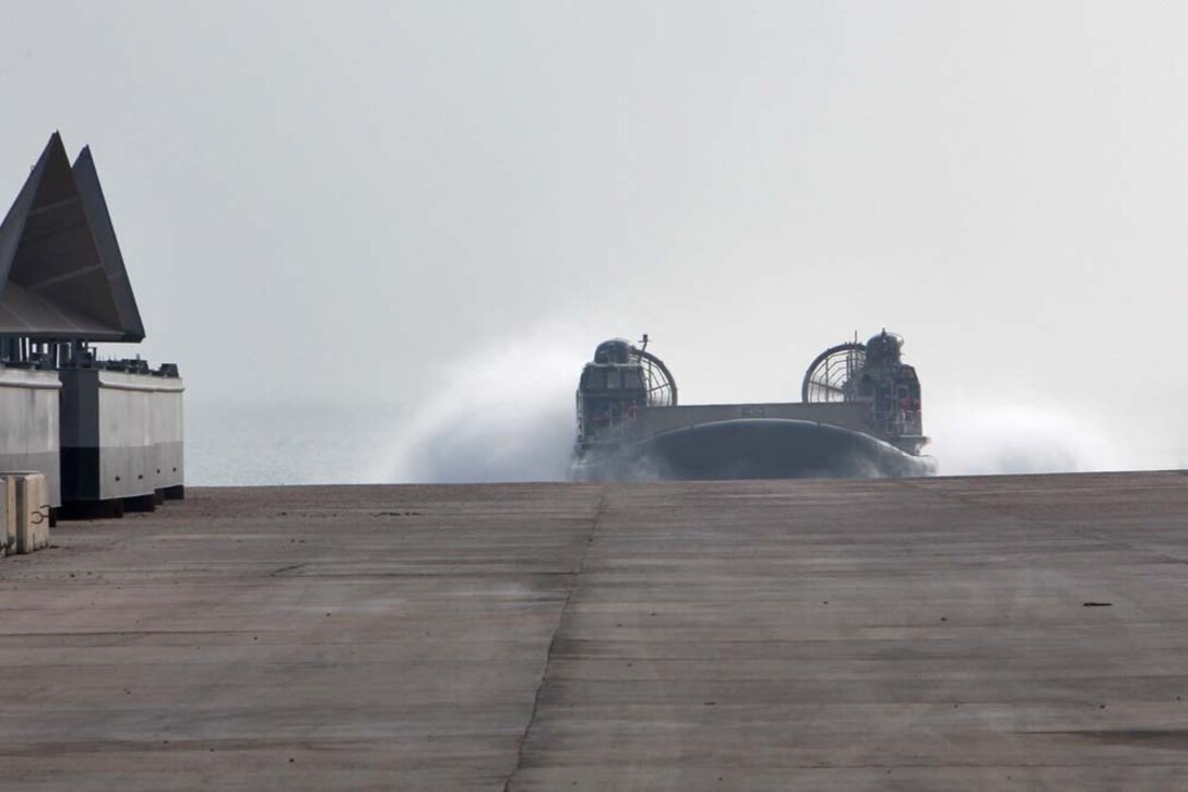 A Landing Craft Air Cushion lands at Camp Patriot, Kuwait, to transport servicemembers from the 15th Marine Expeditionary Unit and their cargo to the USS Rushmore on Nov. 29. The Marines recently completed Eager Mace 13, a routine training exercise that focused on promoting regional security, stability and mutual interests in the region. The 15th MEU is deployed as part of the Peleliu Amphibious Ready Group as a U.S. Central Command theater reserve force, providing support for maritime security operations and theater security cooperation efforts in the U.S. 5th Fleet area of responsibility. (U.S. Marine Corps photo by Cpl. Timothy R. Childers)