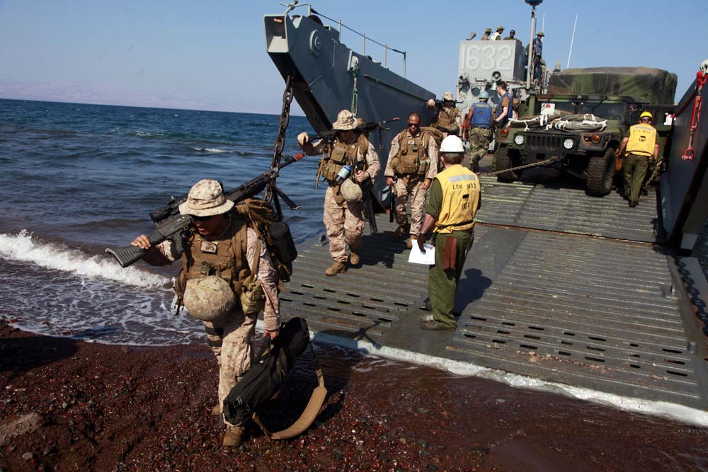 Marines and sailors with Kilo Company, Battalion Landing Team 3/5, 15th Marine Expeditionary Unit, debark a landing craft utility to begin Exercise Amitie, Dec. 8. Exercise Amitie, which is French for friendship exercise, is a multinational training exercise designed to increase interoperability, enhance mutual capabilities and support a sustained presence in the region. During Amitie, elements from the 15th MEU participated in a three-day mounted patrol, land and water obstacle courses, aviation-related evolutions and joint planning. The training was led by the French 5th Marine Regiment and included elements from the 15th Marine Expeditionary Unit, French Foreign Legion, U.S. Army, U.S. Air Force and Djiboutian military. The 15th MEU is deployed as part of the Peleliu Amphibious Ready Group as a U.S. Central Command theater reserve force, providing support for maritime security operations and theater security cooperation efforts in the U.S. 5th Fleet area of responsibility. (U.S. Marine Corps photo by Cpl. John Robbart III)