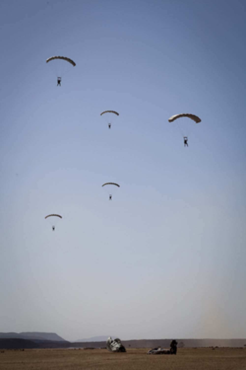 Marines from Force Reconnaissance Platoon, 15th Marine Expeditionary Unit, conducted an 8,000-foot free fall jump, Feb. 8. The 15th MEU is deployed as part of the Peleliu Amphibious Ready Group as a U.S. Central Command theater reserve force, providing support for maritime security operations and theater security cooperation efforts in the U.S. 5th Fleet area of responsibility. (U.S. Marine Corps photo by: Master Sgt John A. Lee, II. / Released)