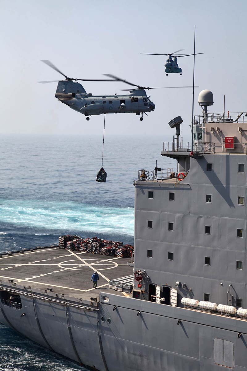 Two CH-46E Sea Knights assigned to Marine Medium Helicopter Squadron 364 (Rein.), 15th Marine Expeditionary Unit, conduct a vertical replenishment from the USNS Patuxent to the USS Peleliu, Feb. 20. The 15th MEU is deployed as part of the Peleliu Amphibious Ready Group as a U.S. Central Command theater reserve force, providing support for maritime security operations and theater security cooperation efforts in the U.S. 5th Fleet area of responsibility. (U.S. Marine Corps photo by Cpl. Timothy R. Childers/Released)