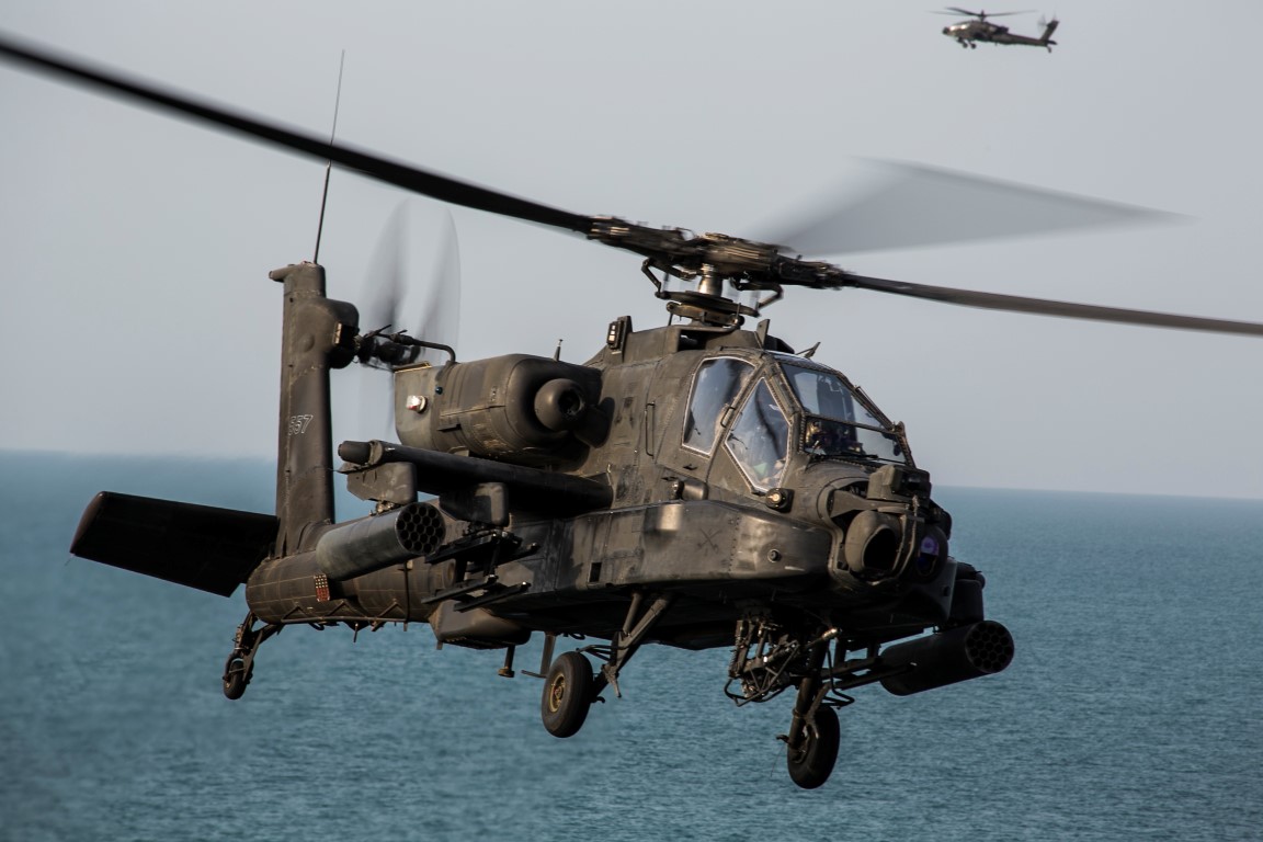 ARABIAN GULF (Sept. 29, 2015) An AH-64 Apache with the U.S. Army’s 185th Theater Aviation Brigade prepares to land aboard the amphibious assault ship USS Essex (LHD 2). These Soldiers practiced landing and departing from the Essex in order to familiarize themselves with flight operations aboard a ship. The 15th Marine Expeditionary Unit, embarked aboard the ships of the Essex Amphibious Ready Group, is deployed to maintain regional security in the U.S. 5th Fleet area of operations. (U.S. Marine Corps photo by Cpl. Anna Albrecht/Released)